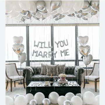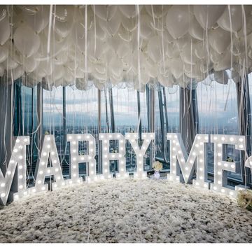 "Will You Marry Me" spelled out in large 4-foot marquee letters, complemented by balloons hanging from the ceiling and rose petals covering the floor. Imagine a romantic ambiance with flameless candles lighting a rose petals lined path.