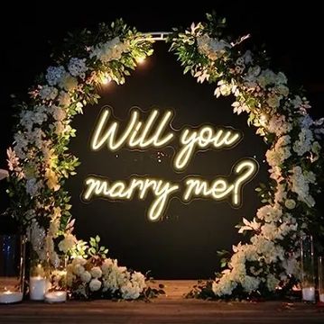 "Will You Marry Me" Neon Sign elegantly displayed at the center of a Floral-Covered Arch, perfect for creating memorable proposal themes. The setting is beautifully enhanced with a blend of lush floral arrangements and flameless candles, providing a romantic ambiance.